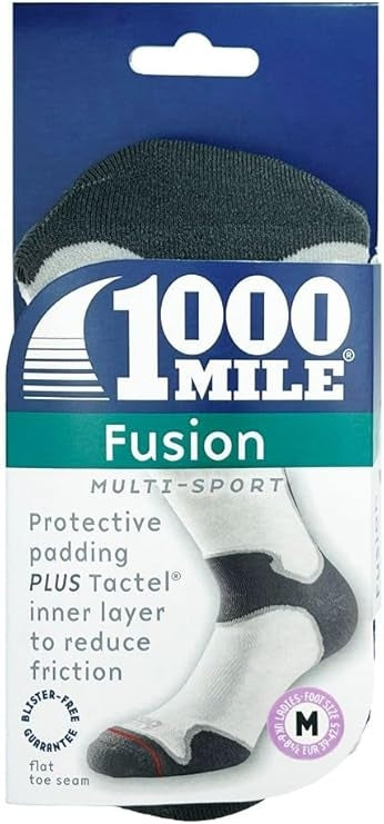 Conventional sock wisdom dictates that you can either have padding for protection and comfort, or two layers for reduced friction. Padded socks are thick, double layer socks are thin. The 1000 Mile Fusion Sock breaks that mould with innovative design and material technology to provide a sock that offers everything: the 1000 Mile double layer sock’s blister-free guarantee, but with padded comfort and protection, including full-length achilles tendon padding. The black version features a longer leg for trail and off-road running, so is also suited for winter use.